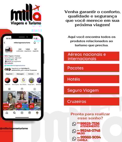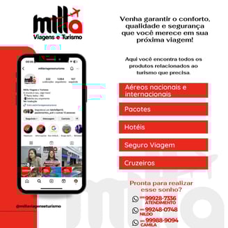 A Milla Viagens e Turismo nasceu para transformar sonhos em realidade. Com dedicação e paixão pelo que fazemos, oferecemos um atendimento personalizado e experiências únicas que marcam a vida de nossos clientes. Realize sua viagem dos sonhos conosco e descubra o mundo de forma especial!